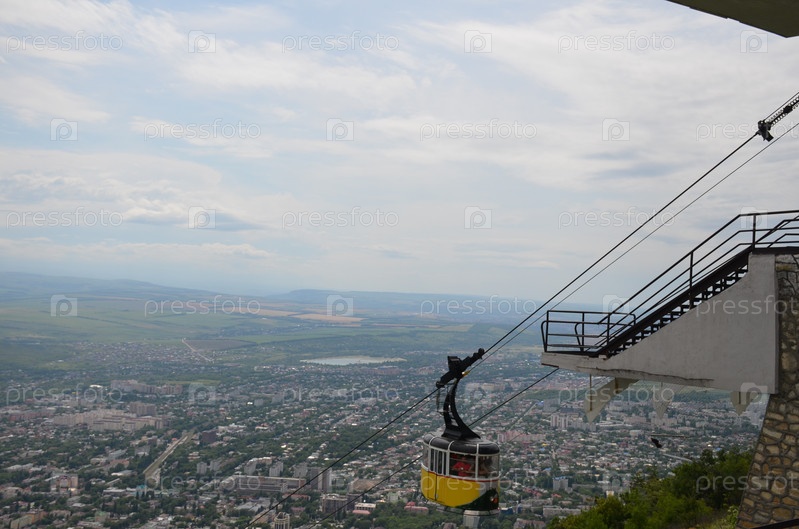 Верхняя станция пассажирской маятниковой бегопорной канатной дороги города Пятигорска на горе Машук, желтый вагончик фуникулера, панорама Пятигорска у подножия горы Машук в летний день