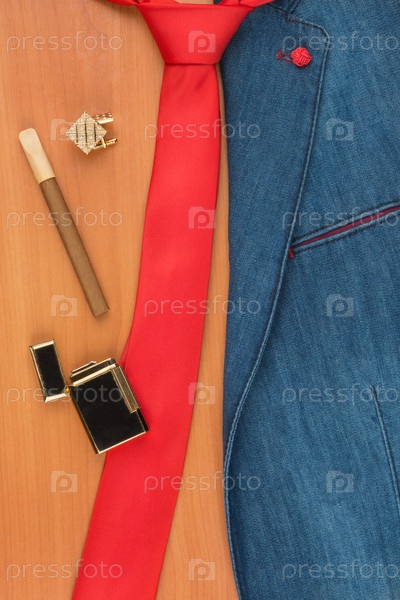 Джинсовая куртка, запонки, сигара и зажигалка лежат на деревянной поверхности, с местом для текста
