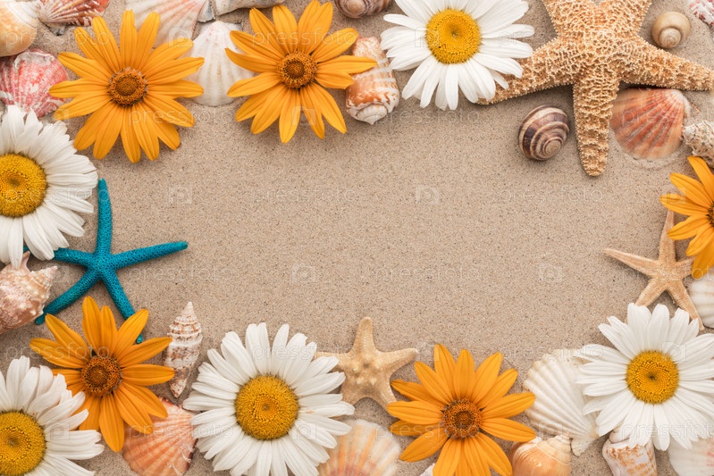 Красивая рамка состоит из цветов, морских звезд, морских ракушек, лежащих на песке