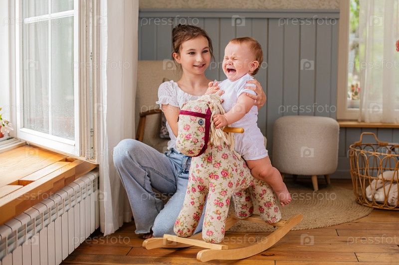 Старшая сестра успокаивает плачущего ребенка на лошадке-качалке в интерьере детской комнаты