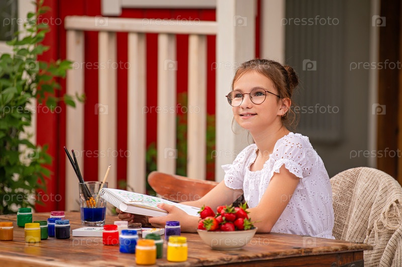 Молодая девушка с радостью участвует в рисовании акварелью на открытом воздухе