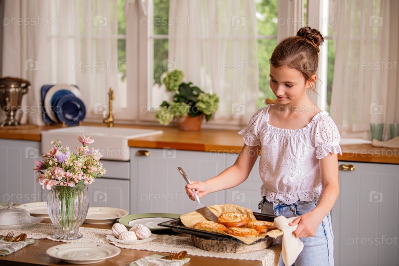Счастливая девушка держит в руках противень со свежеиспеченными пирогами в интерьере кухни загородного дома