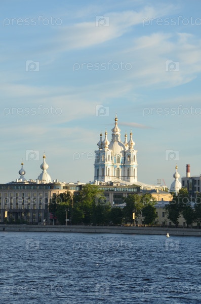 Вид на Смольный собор – православный храм в стиле барокко (объект культурного наследия России) и Смольную набережную со стороны Невы в Санкт-Петербурге