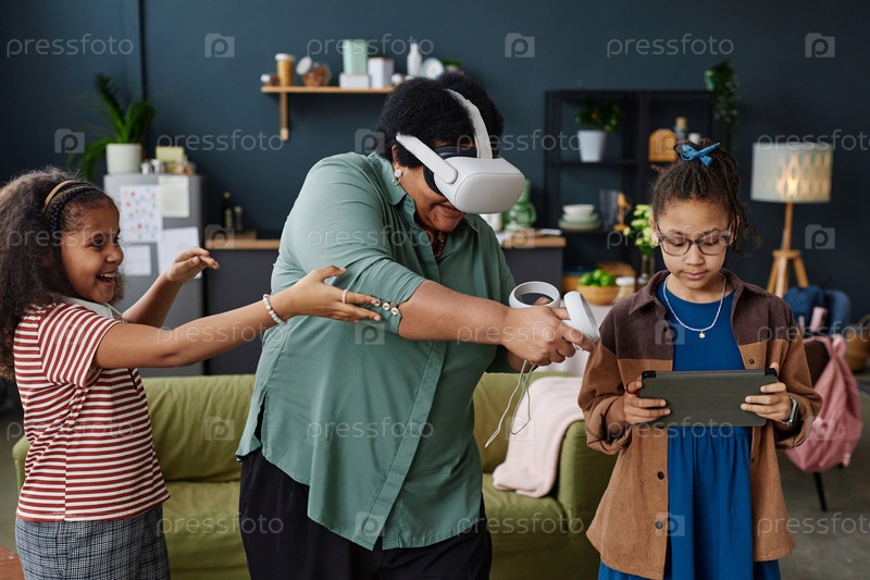 Черная бабушка играет в VR-игру с двумя девочками