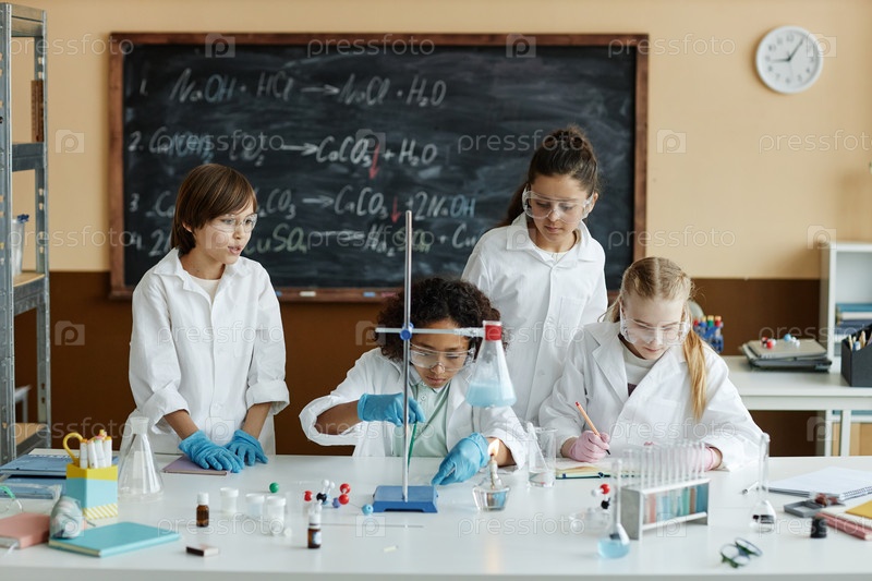 Мальчики и девочки во время урока химии