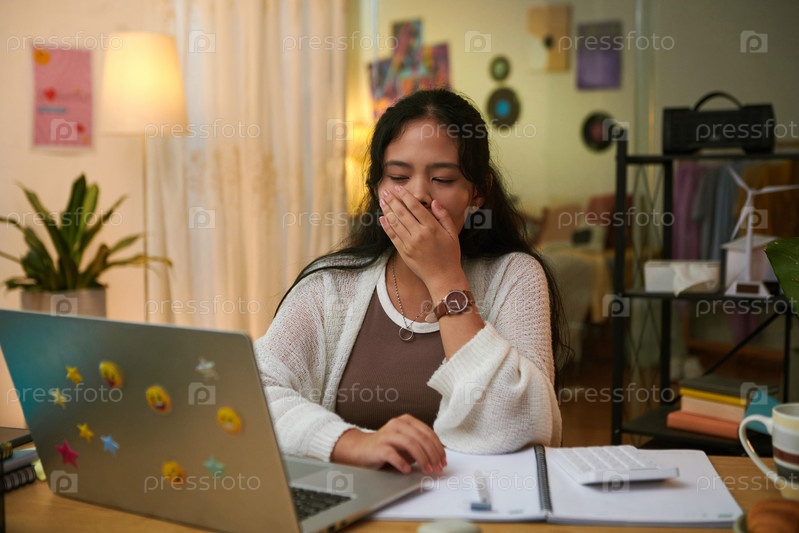Ученица зевает, когда учится дома