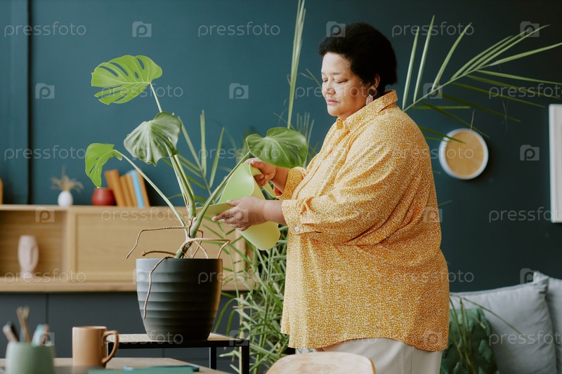 Домашняя хозяйка поливает цветок