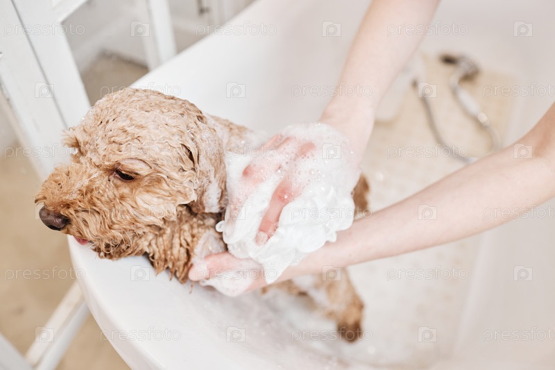 Мокрая собака Maltipoo моется мылом