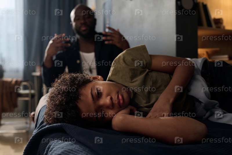 Мальчик лежит на кровати с родителем в фоне