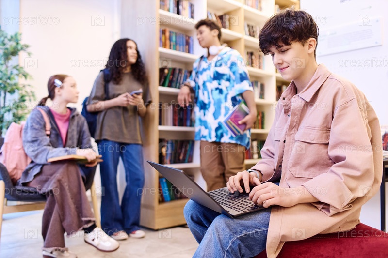 Использование компьютера в библиотеке со студентами мальчик