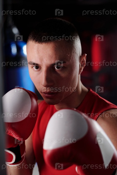 Боксёр стоит перед боксерским мешком