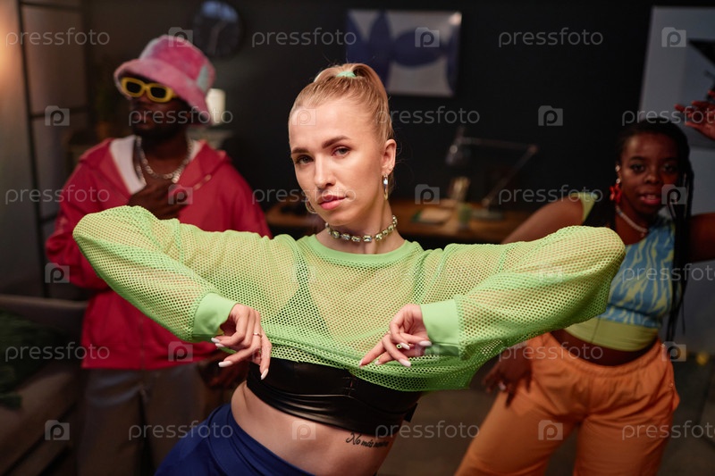 Акцент танцевальной команды на девушке, носящей неоновый зеленый костюм