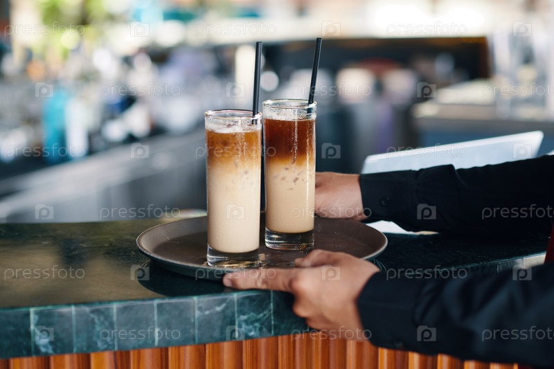 Официант берет поднос с напитками