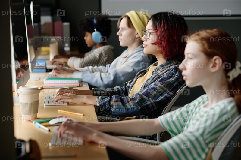 Азиатская девочка, печатающая на компьютере во время занятий по информатике