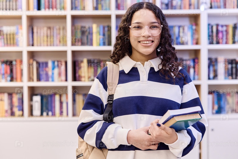 Девушка, которая носит очки и стоит в библиотеке с книгами