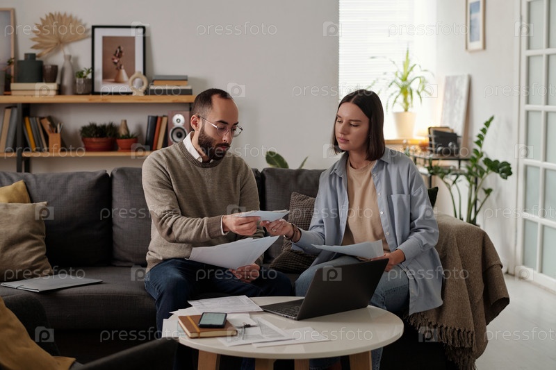 Мужчина передает кучу квитанций жене