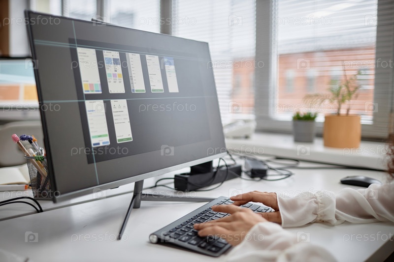 Женщина, работающая на компьютере и разрабатывающая мобильные приложения