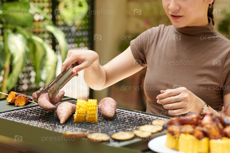 Женщина, переворачивающая овощи на гриле