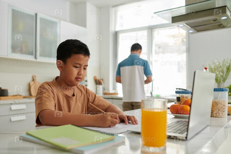Мальчик, выполняющий домашнее задание на столе кухни