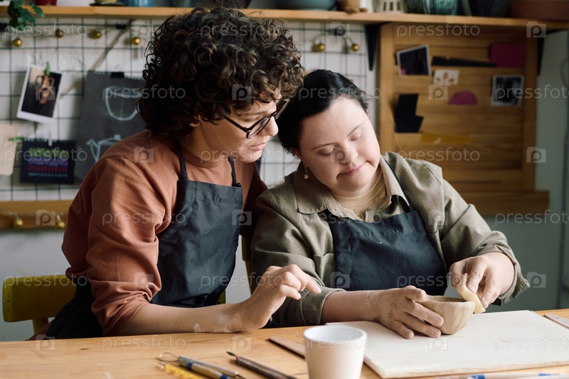 Зрелая женщина учит девочку с инвалидностью, как сделать сосуд