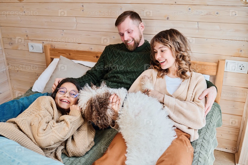 Веселая семья с собакой дома