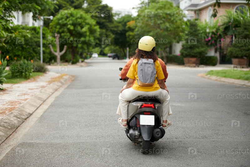 Задний вид молодой пары на мотоцикле