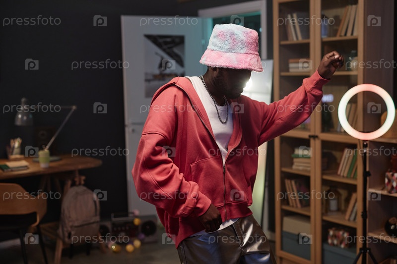Черный молодой человек танцует и носит розовый наряд