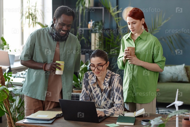 Разнообразные бизнес-команды, использующие ноутбук в зеленом офисе