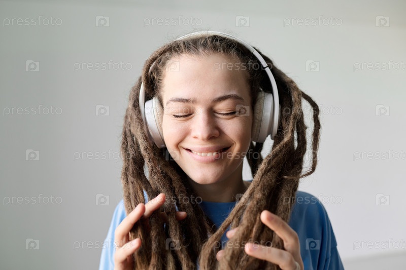 Женщина с длинными дредоликами слушает музыку со улыбкой
