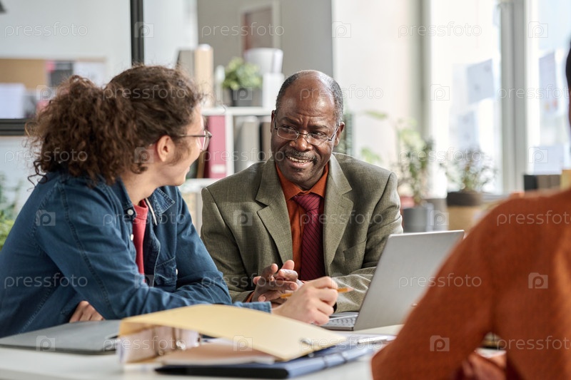 Улыбающийся старший бизнесмен разговаривает с молодым коллегой