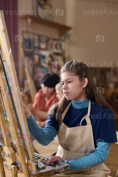 Девушка-подросток с инвалидностью рисует в классе искусства, сидящая у Изеля