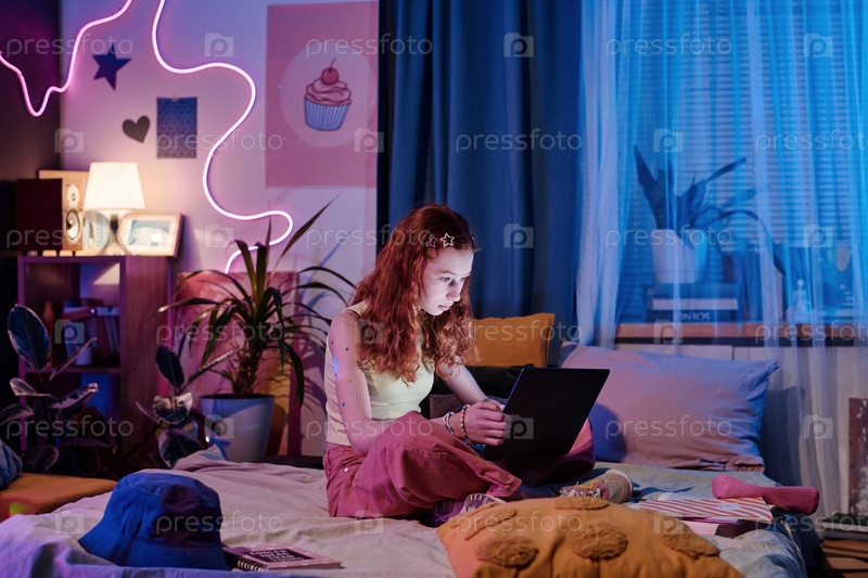 Девушка-подросток, сидящая на кровати и использующая ноутбук вечером