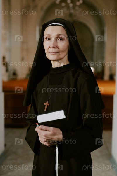 Зрелая монахиня, стоящая в церкви