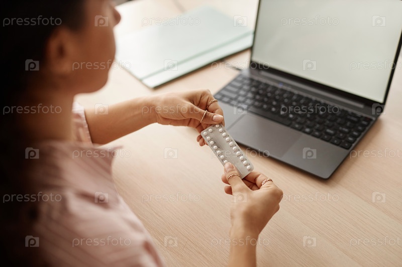 Девушка, держащая пузырь противозачаточных таблеток на ноутбуке