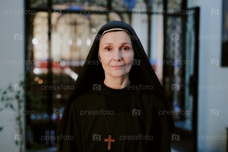 Зрелая монахиня в черной одежде смотрит на камеру
