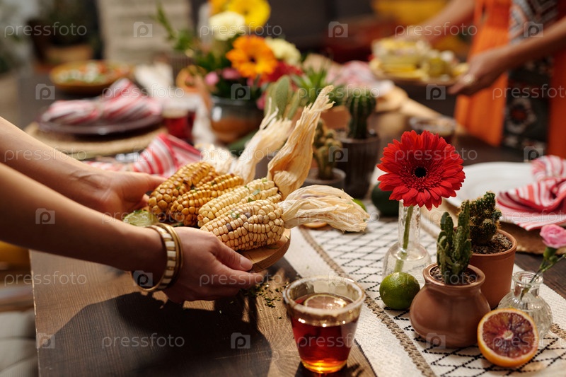 Положить поднос с домашней кукурузой на стол