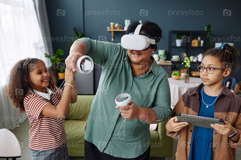 Черная женщина играет в VR-игру с двумя старшими девочками