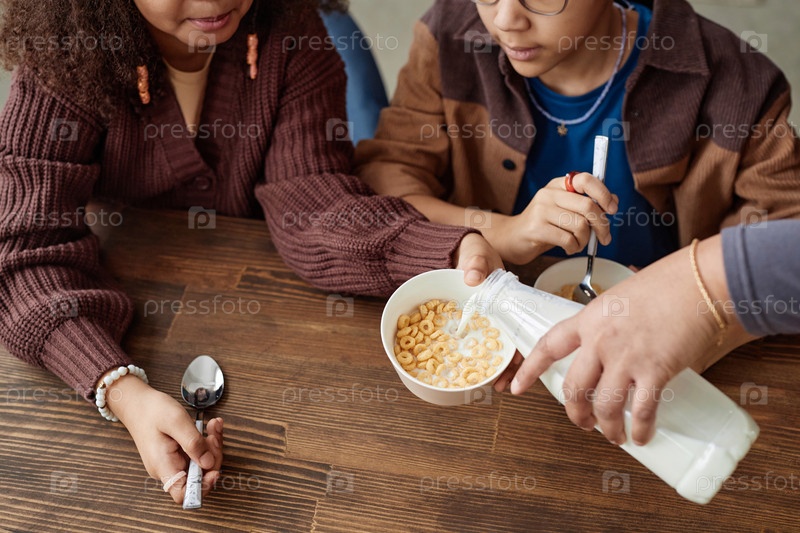Top View Девушки едят хлопья на завтрак Рука наливает молоко