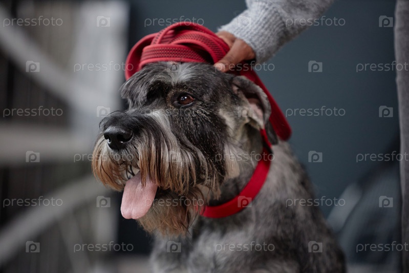Серая шнаузерская собака с красным воротничком