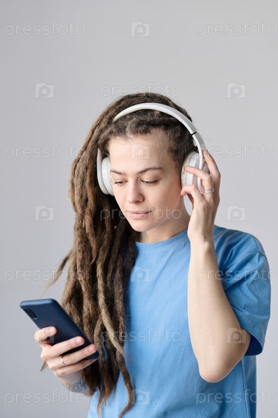 Женщина с дрейдолями слушает музыку через смартфон на белом