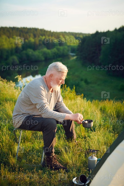 Старший мужчина готовит еду в лагере