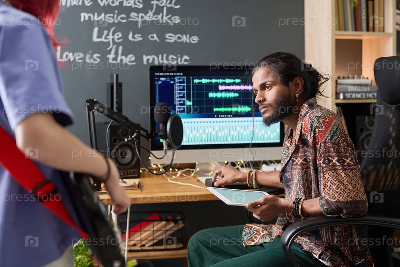 Мужчина смотрит на девушку, играющую на бас-гитаре