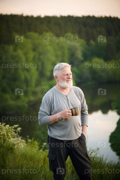 Мужчина с бородой наслаждается временем в Риверсайде зрелый