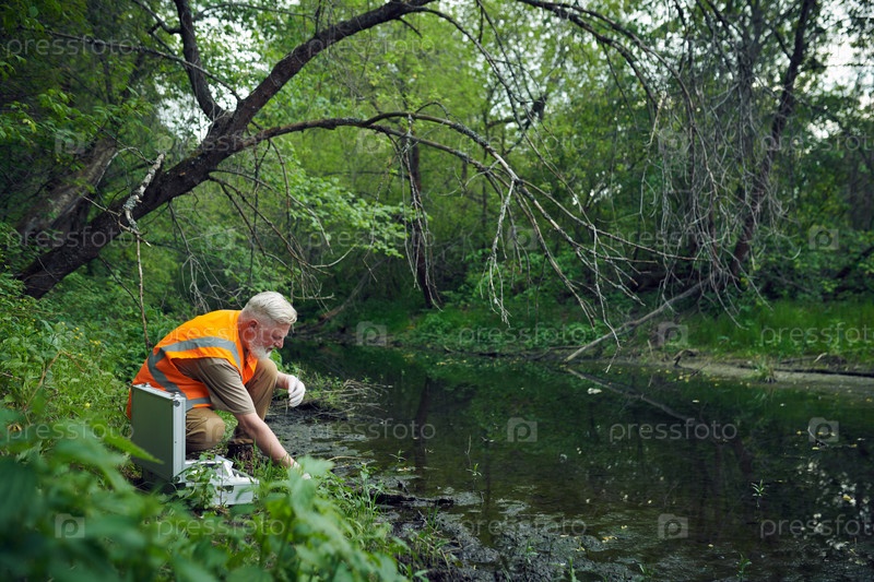 Эколог берет образцы на берегу реки