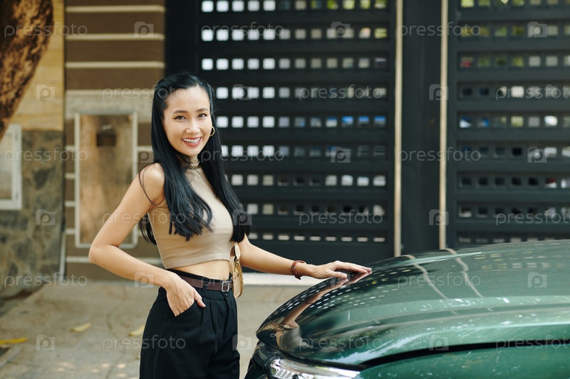 Счастливая женщина, стоящая рядом со своей машиной