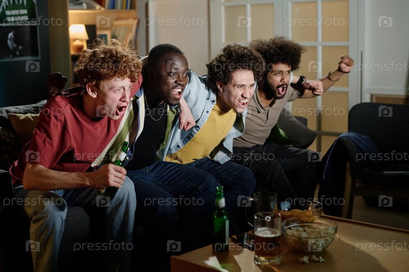 Четыре молодых человека наслаждаются просмотром спортивного мероприятия по телевизору