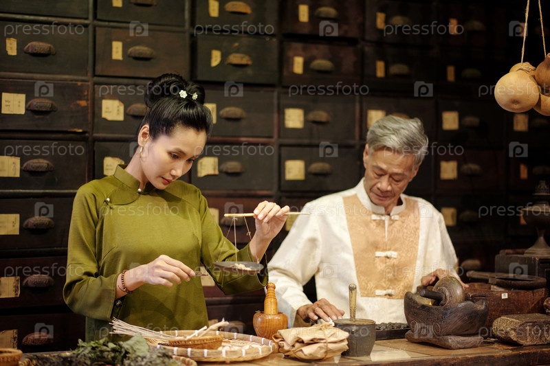 Медицинские работники, работающие с травами в аптеке