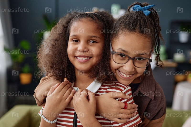 Две чернокожие девушки как сестры, обнимающиеся