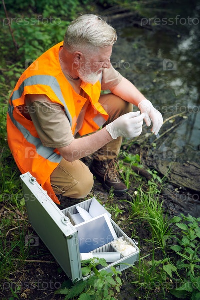 Зрелый ученый берет образец воды