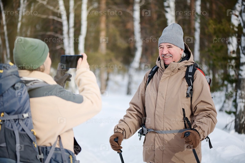 Веселый старый турист-мужчина позирует для фотографии
